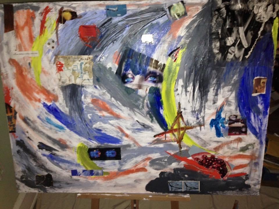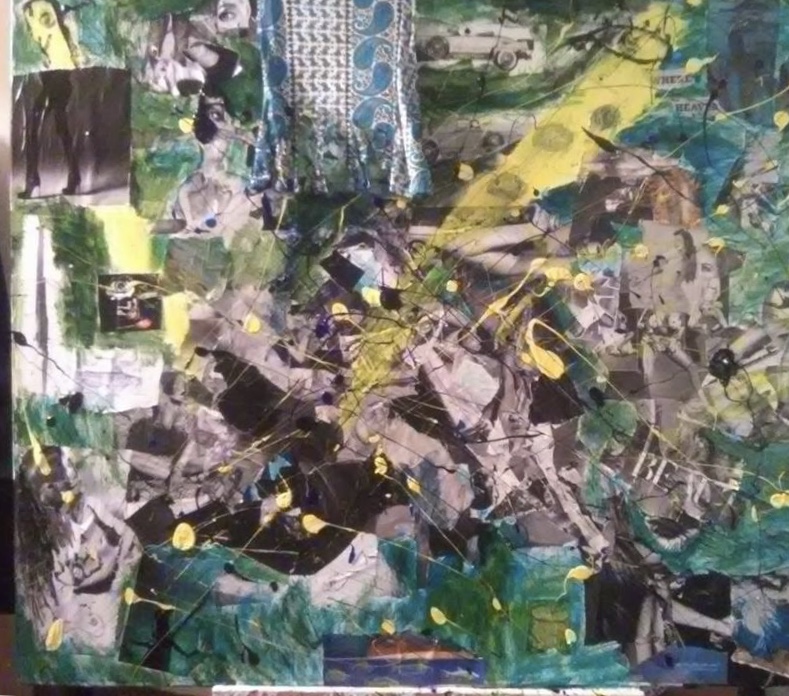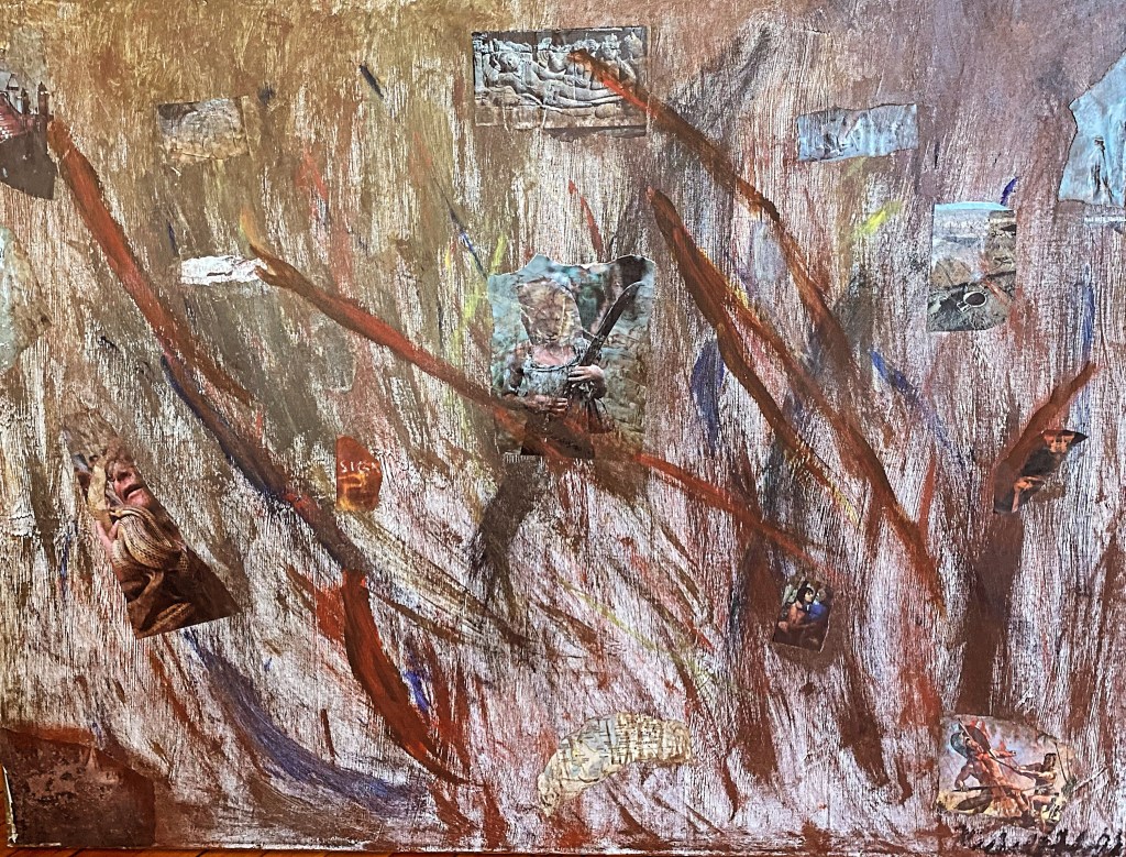 As I layered collage fragments of hands and faces into the swirling green, they became symbols of humanity’s influence—both its ingenuity and arrogance. These black-and-white, fragmented figures feel almost ghostly, as if watching the scene from a distance or from another time. They suggest those who once chose Andromeda’s fate, their faded presence a testament to the potential consequences of humanity’s reckless attempts to tame the wild. For me, these faces and hands aren’t only witnesses to Andromeda’s victory but silent reminders of the technology-driven world that can seem blind to nature’s force, or, worse, at odds with it.