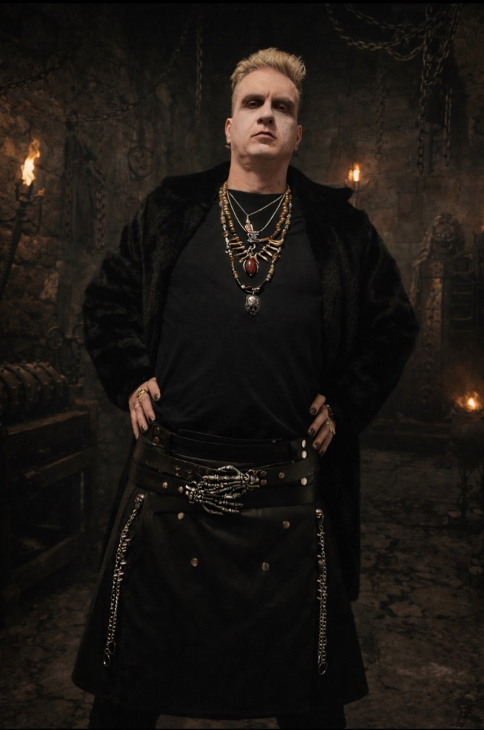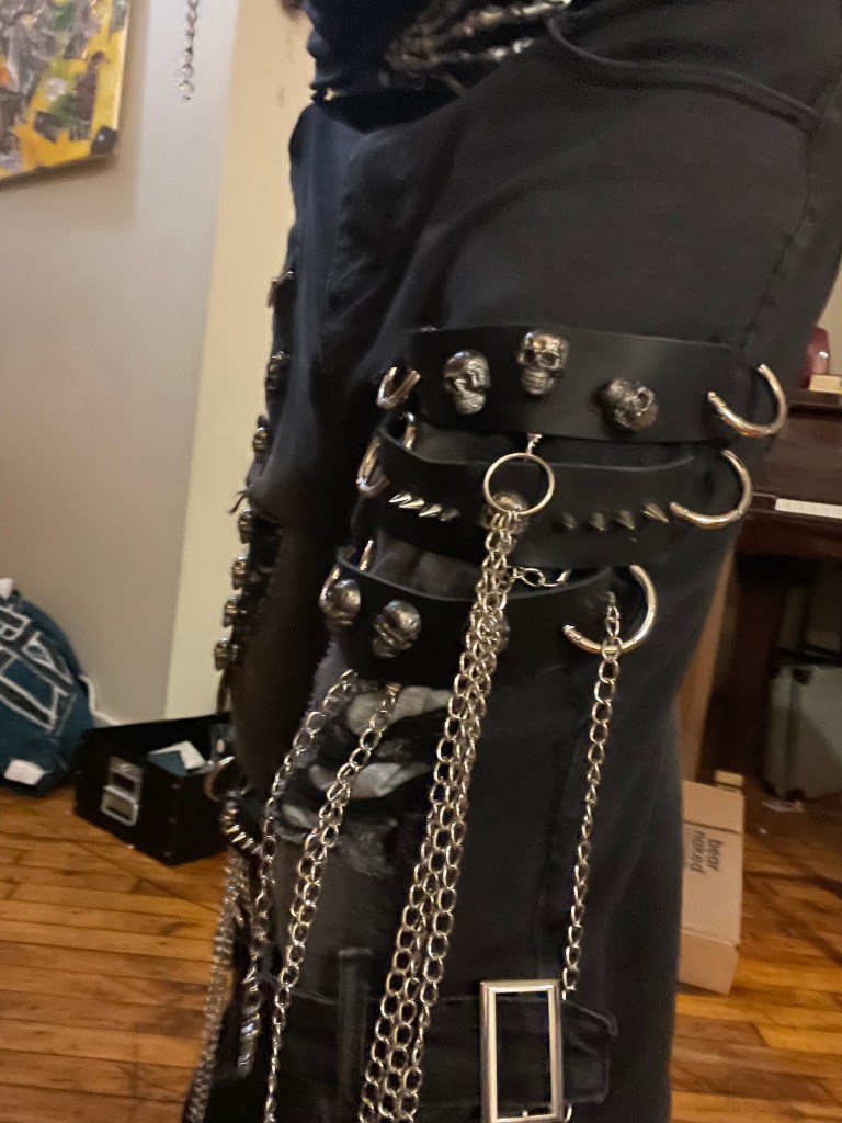 Reconstructed from reclaimed garments and reinforced with industrial hardware, including skeleton hand belts and suspended skull chain accents. Hand-altered and rebuilt as wearable ritual armor.